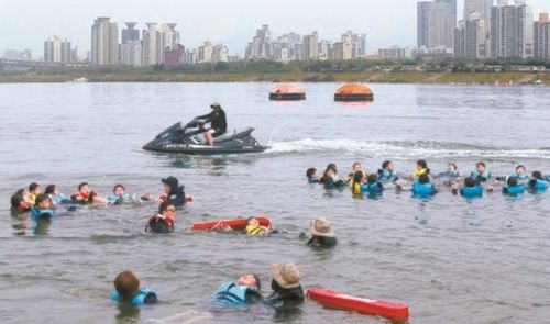 ソウルS小学校の児童が今月14日、漢江(ハンガン)でライフジャケットを着て生存水泳教育を受けている。