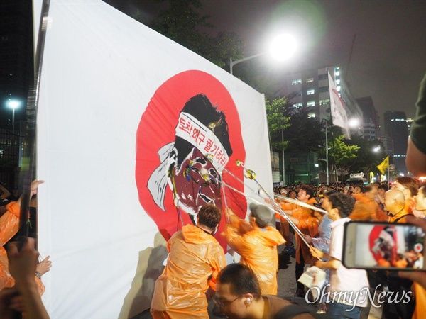 市民たちが釜山の日本総領事館前で安倍総理の顔が描かれた横5m、縦4mの大型横断幕にペイント・ダメージを加えた。積弊清算・社会大改革釜山運動本部が7月27日夕方、日本総領事館前の道路で街頭行進の仕上げ集会を開き、このような象徴儀式を行った。